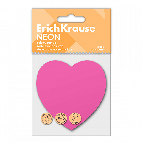 Блок самоклеящийся бумажный ErichKrause Heart Neon, 50 листов, розовый /