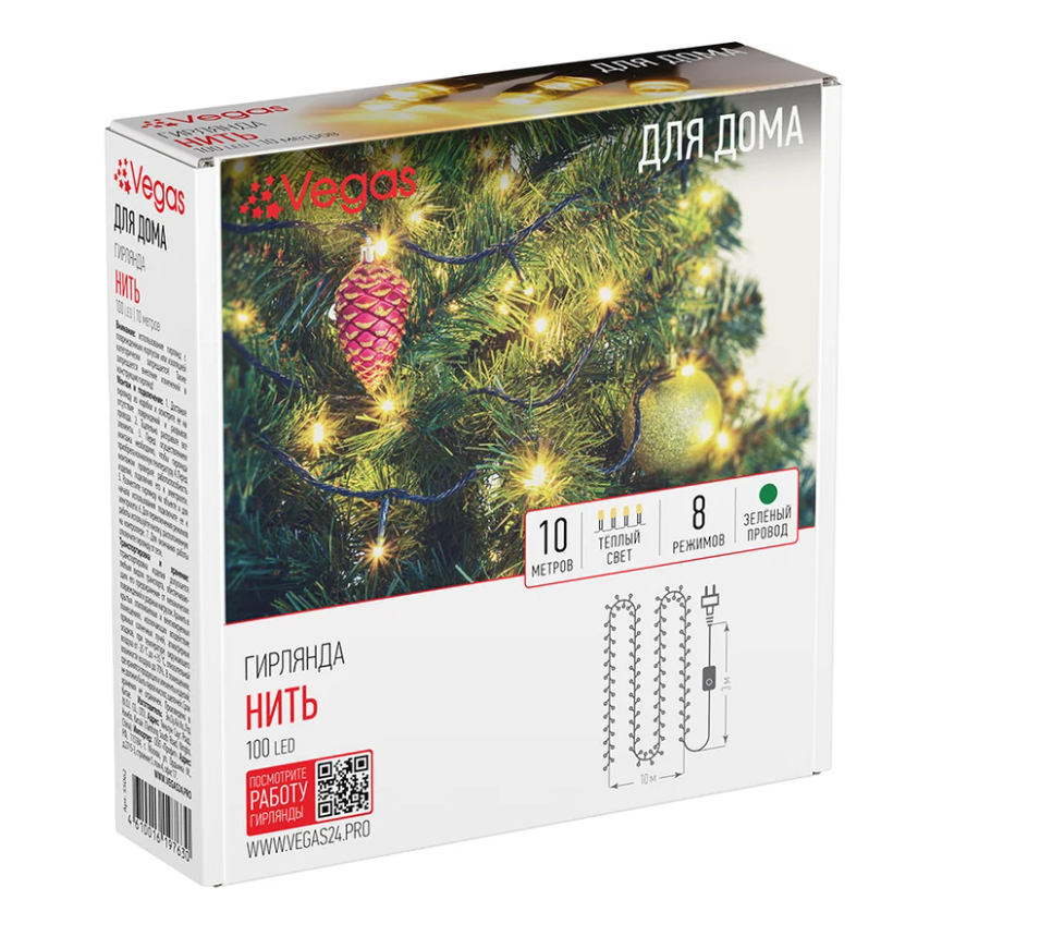 Гирлянда VEGAS "Нить" 100 теплых LED ламп, 8 режимов, зеленый провод 10м, 220v /