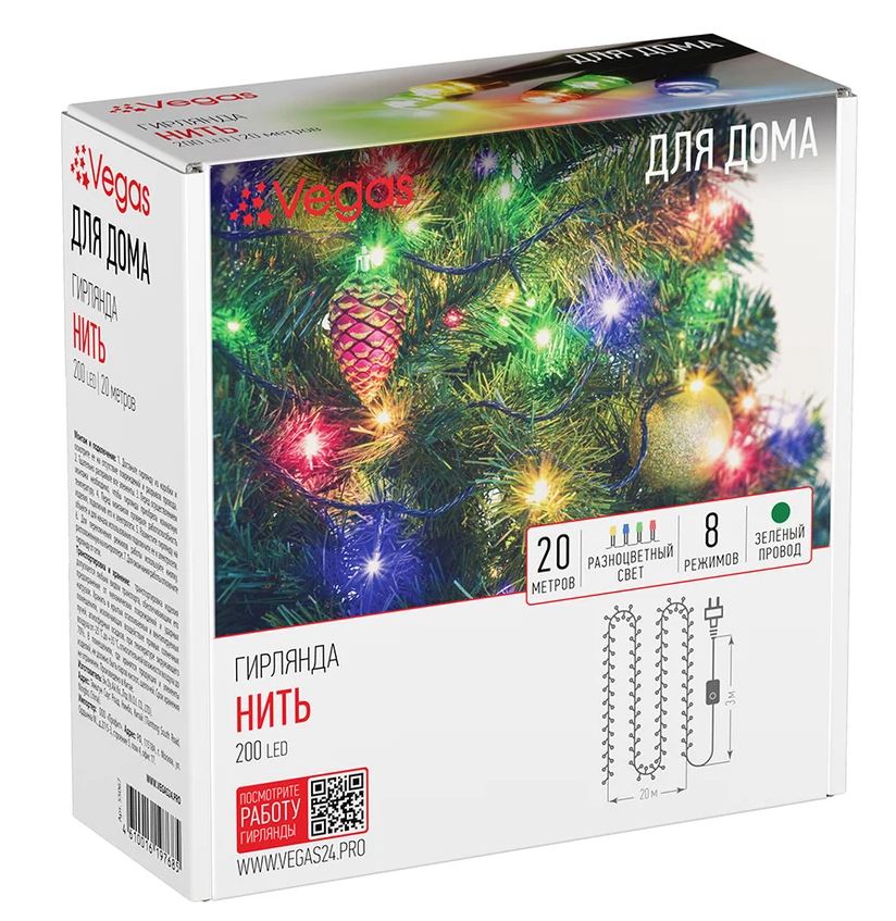 Гирлянда VEGAS "Нить" 200 разноцветных LED ламп, 8 режимов зеленый провод, 20м, 220v /
