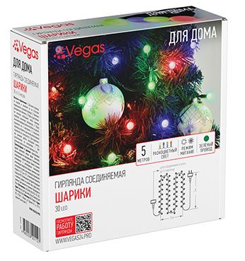Гирлянда VEGAS "Шарики" 30 разноцветных мигающих LED ламп зеленый провод 5м соединяемая 220v /