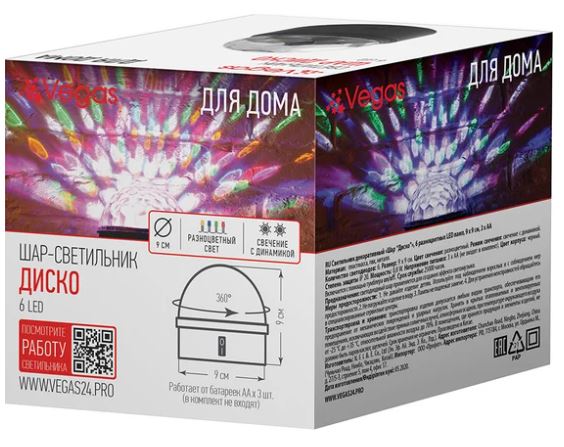 Шар ДИСКО светодиодный 6 разноцветных LED ламп 9х9см 3АА /