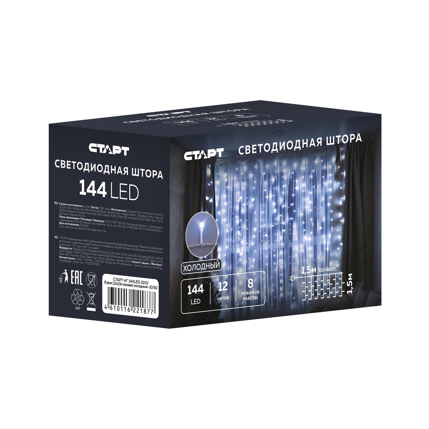Гирлянда СТАРТ Занавес 144LED 12 нитей 8 режимов 1,5х1,5м 220V холодный свет /