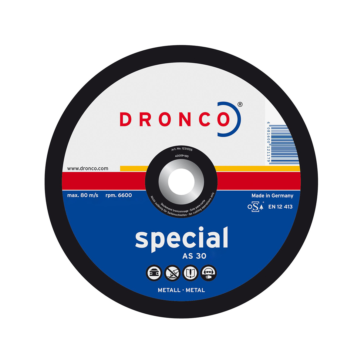 Отрезной круг немецкого бренда DRONCO AS 30 T special для УШМ (болгарка) . Чистый разрез, выполненный этим специальным тонким отрезным кругом, позволяет осуществлять обработку листового материала, не приводя к короблению материала и нежелательному образованию заусенцев. Для листовой стали, особенно при производстве заправочных емкостей и резервуаров.